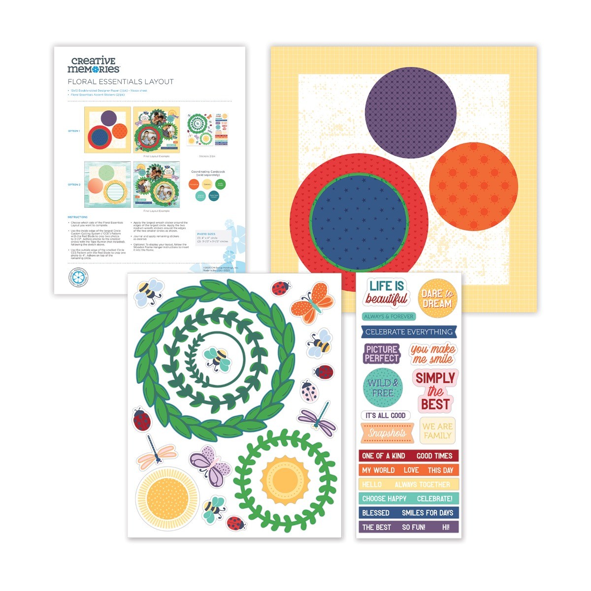 - The Floral Essentials Layout, which features a base sheet of 12x12 double-sided designer paper (1/pk) and Floral Accent Stickers (2/pk) that make a bloomingly beautiful springtime layout together.